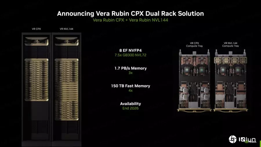 英伟达创办人暨首席执行官黄仁勋指出,Rubin CPX是首款专为大规模场景AI设计的CUDA GPU。该平台与Vera Rubin CPU及Rubin GPU协同运行,组成的Vera Rubin NVL144 CPX平台,单一机架下可提供高达8 exaflops的AI运算能力,性能是现有GB300 NVL72系统的7.5倍。为了支撑如此严苛的AI工作负载,Rubin CPX系统必须配备惊人的内存配置,100TB内存与每秒1.7PB的带宽,确保数据能以极高速流动。