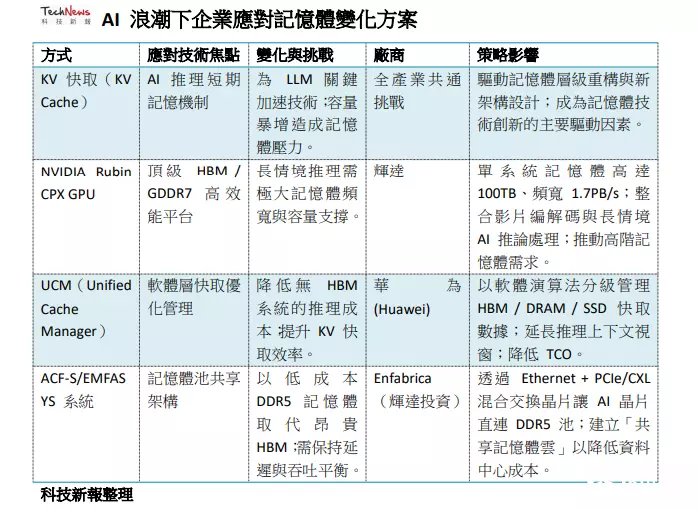 KV缓存为AI模型的短期记忆,解决方案成产业观关注焦点而在AI市场需求爆发的情况下,带动内存容量需求暴增的关键技术之一,便是大语言模型在推理阶段使用的“注意力机制”及由此衍生的“KV缓存”(KV Cache)机制。现阶段在AI推理过程中,模型会用到类似人脑的注意力机制,必须记住查询中重要的部分(Key)以及上下文中重要部分(Value),以便回答提示。传统上,如果每处理一个新的token(新词),模型必须针对先前处理过的所有token重新计算每个词的重要性(Key与Value),以更新注意力权重,过程极为耗时。而为解决此瓶颈,LLM被加入KV缓存机制。KV缓存类似于学生做笔记的概念,它能将先前的重要资讯(Key与Value)存储在内存中,免去每次重新计算的成本,从而将token处理与生成速度提升数个数量级。