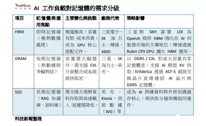 AI工作负载对内存的需求分级AI模型,特别是大语言模型(LLM),对数据记忆的需求类似于人类大脑,必须有不同层次的“记忆”来处理即时、短期和长期的资讯。根据市场消息指车,AI时代对内存需求因数据被细分为三个主要层级,每个层级对应不同的内存产品,这也决定了未来内存市场的产品组合与营收结构。